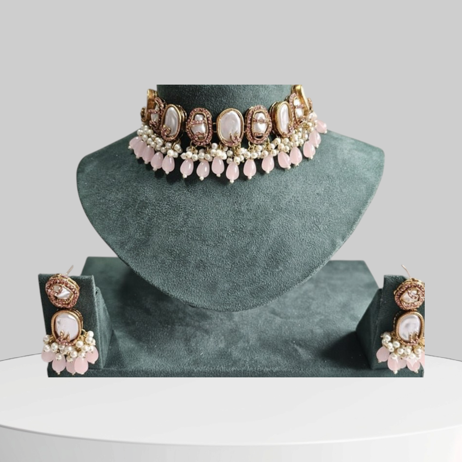 The lower edge boasts a luxurious fringe: a rich cascade of small white pearls interspersed with beautiful, soft blush pink teardrop beads that hang delicately, adding movement and a romantic finish. The ensemble is completed by matching dangler earrings that perfectly mirror the choker’s elegant oval stone, pearl clusters, and blush pink drops.
